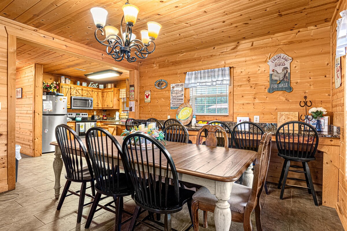 Inside, the main level features a spacious living room with a flat screen TV and a gas fireplace, creating the perfect setting for relaxation. The dining area seats 16, ideal for gathering everyone together for meals. The fully stocked kitchen is ready for you to unleash your inner chef.