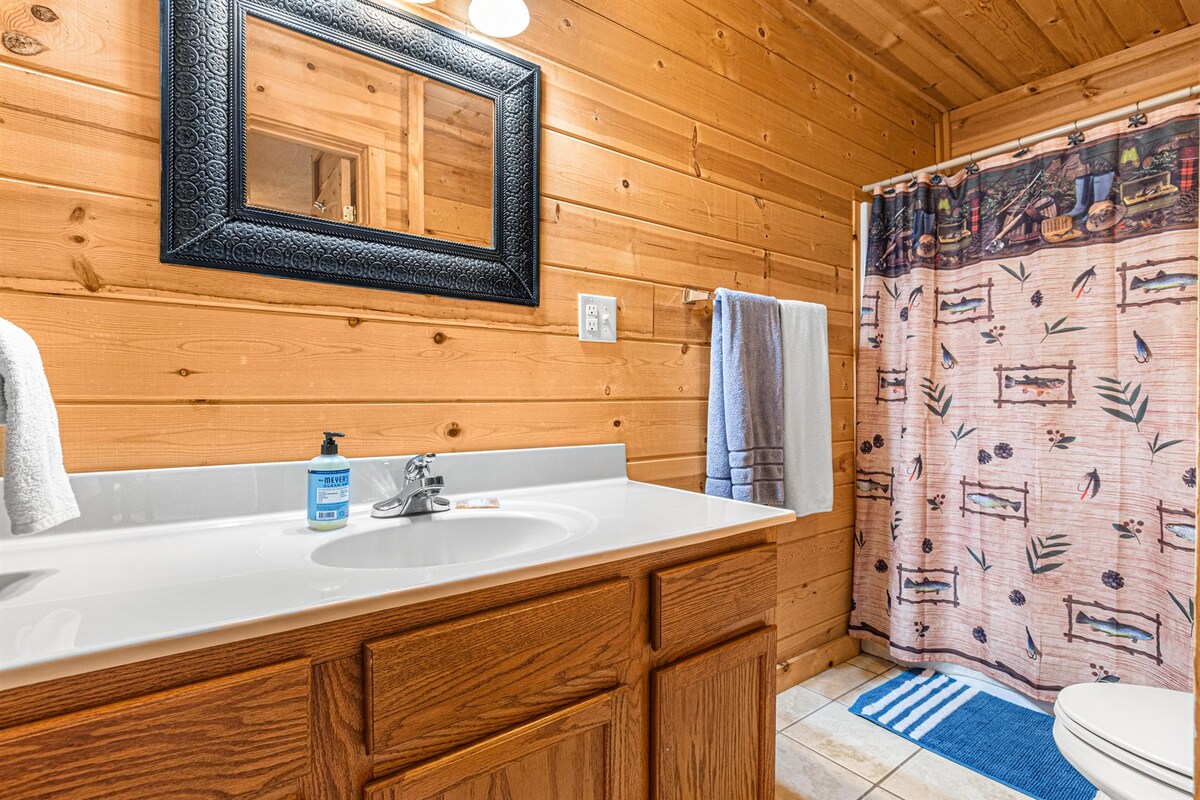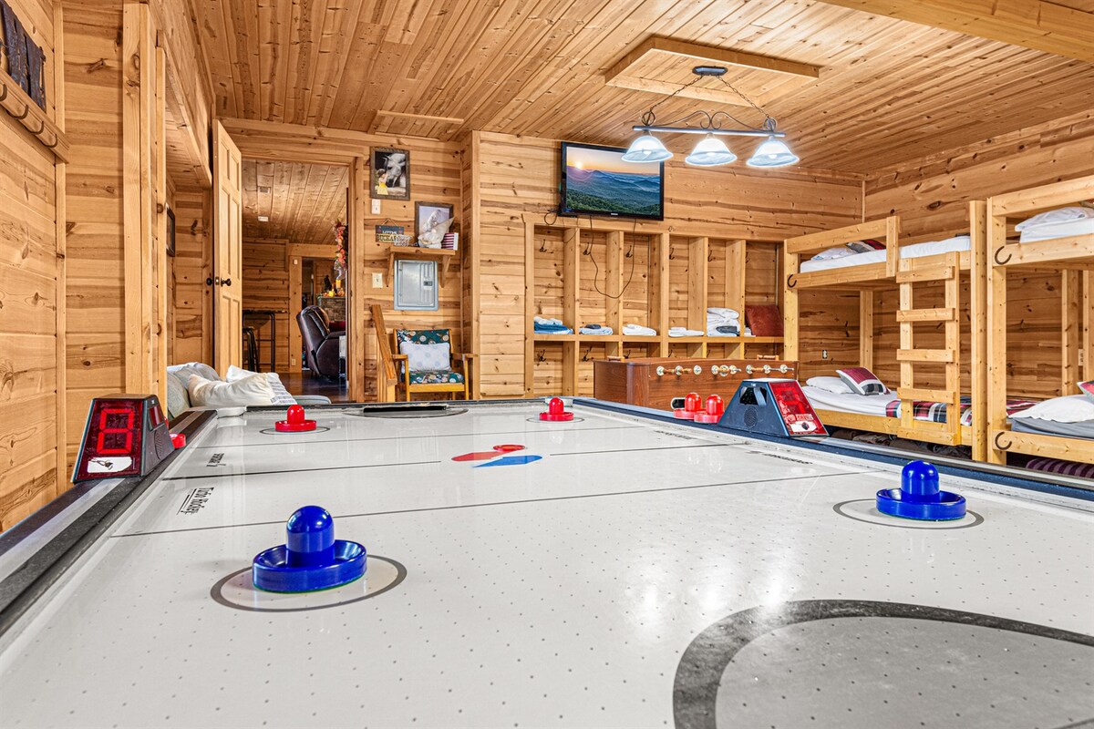 For endless fun, the ultimate bunk house and game room awaits on the main level. It’s equipped with 6 bunk beds, accommodating up to 12 people, and features games like a pro ping pong table along with a flat screen TV for watching the ‘Big Game’. A bathroom conveniently connects this room to the living area.
